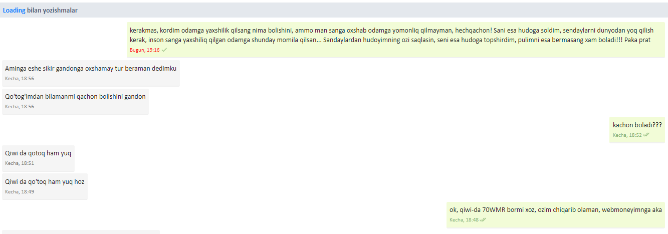 foydalanuvchini hudoga soldim! Shunday firibgarni umrimda kormadim! 70WMR pul boshida qolsin kerakmas manga qarzi.