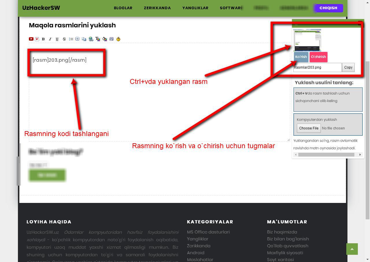 2. kompyuterning ekranini rasmga olinganida (PrtSc) Ctrl+v orqali tashlaysiz rasm avtomatik yuklanadi va avtomatik textareaga ichiga [rasmlar]https://site.uz/rasm.png[/rasmlar] qilib tashlaydi.