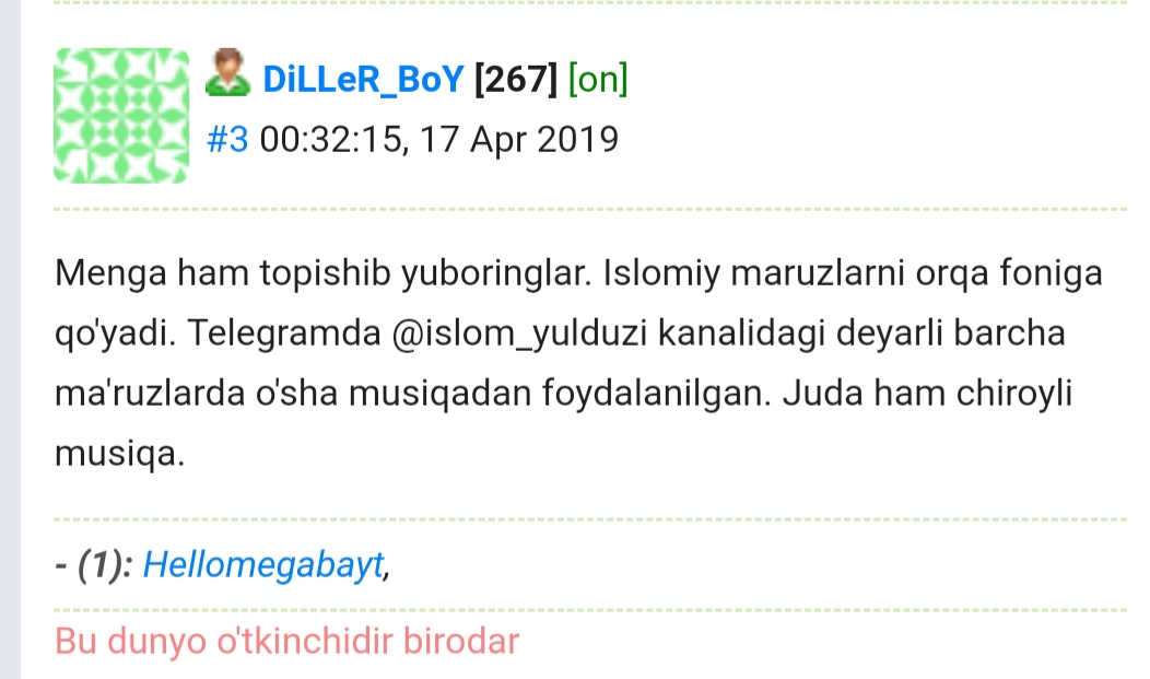 Meni shikoyatim bor edi MasterOs degan forumdoshda. To'g'ri u ban olibdi 10 yilga xudoga shukr deb tursam endi boshwa profil ochib yana asabga tegyapti. Mana shundaqa bir ahmaq foydalanuvchilarni ip manzilini banlab tashlameslarmi? Qilar ishi so'kinish bilan - bosish bo'lyabdi. Men bir narsaga hech tushunmaymanda nega endi yomonlik kovlayeradibular? Mawsadi nima o'zi? Ko'ea olmaslikmi? Fisqu fasod chiqarib nimaga erishadi bular? 27 soniyadan keyin yozdi: