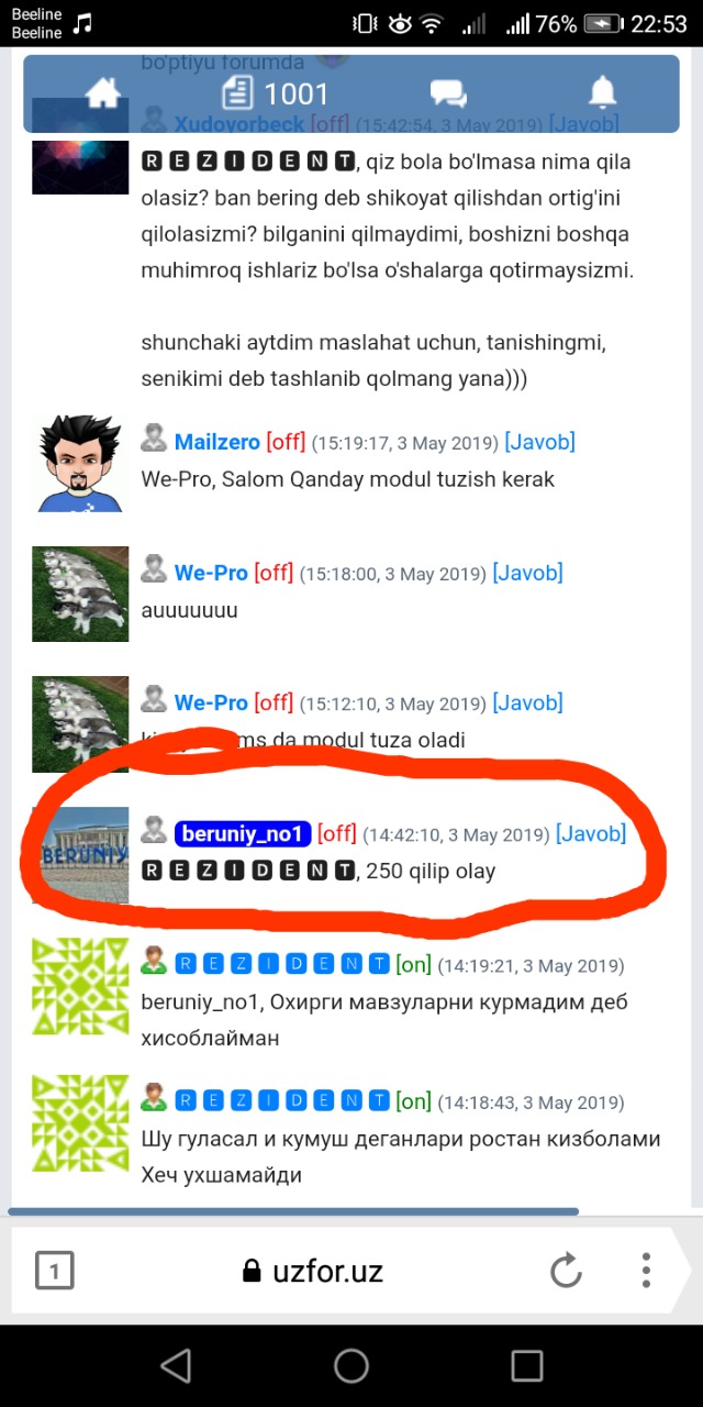 Forumda yosh bolalar ko'payib ketibdi. hammasiyam emas bittasi juda yoshlik qilyapti uni harakteriuini o'zini tutushini ko'rgan odam bog'cha bolasi deb o'ylaydi. g'irt laganbardor. o'zim kimman demaydi. birovlarni sayti haqida keraksiz bo'lmag'ur degan fikrlar qoldiradi ishtoni yo'q tizzasi yirtiqqa kulibdidan bo'lyapti bu yog'i. yana mani postlarimga salbiy "-" bosib chiqyapti