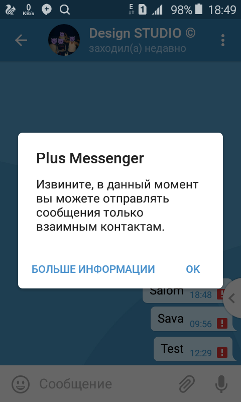 Ваш аккаунт временно ограничен: Вы не можете писать тем, кто не сохранил Ваш номер в список контактов, а также приглашать таких пользователей в группы или каналы. Если незнакомый пользователь напишет Вам первым, Вы сможете ему ответить.