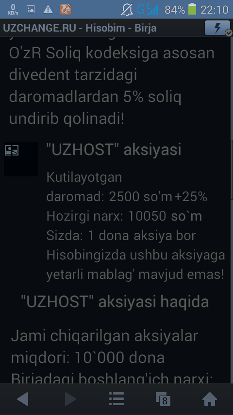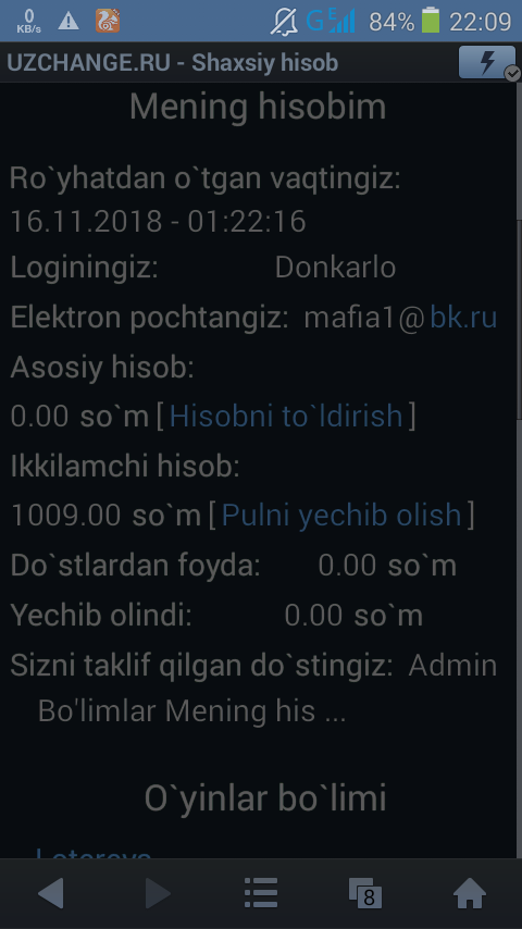 1. Proyekt: UzChange.Ru - Aksiyalar birjasi. 2. Proyekt ochilgan sana: 2017-yil, dekabr. 3. Sarmoya: 311630.85 so`m | To`landi: 195408.00 so`m 4. Sarmoyadorlar: 154 5. Ball (Cash Point): Mavjud emas. 6. Daromad nisbati: 10% sotib olish va 90% yechib olish hisobiga 7. Minimal sarmoya miqdori: 10000 so'm 8. Minimal yechib olish miqdori: 1500 so'm 9. To'lov tizimlari: UzCard, Payeer, Webmoney, Qiwi 10. Referal tizimi: kiritilgan mablag'dan 1%