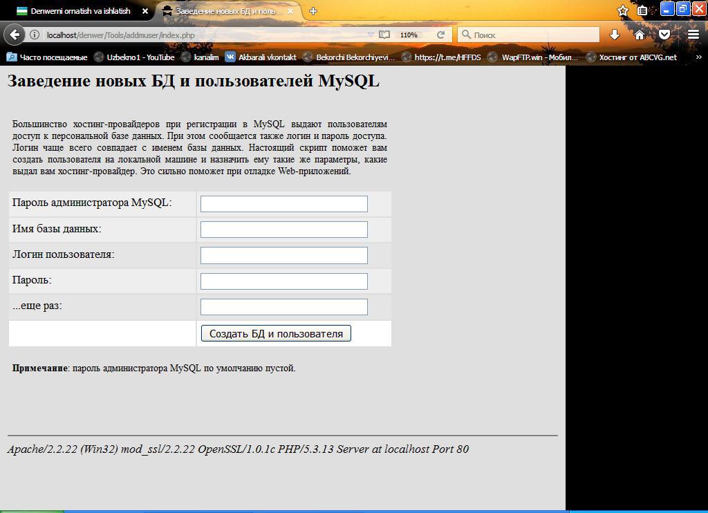 Denwerda mysql bazani qanday yaratdi localhost/phpmyadmin dan kirdim lekin baza yaratishni bilmadim.localhost/ ga kirib pastroqqa tushsangiz Заведени новыи БД и пользователей MySQL