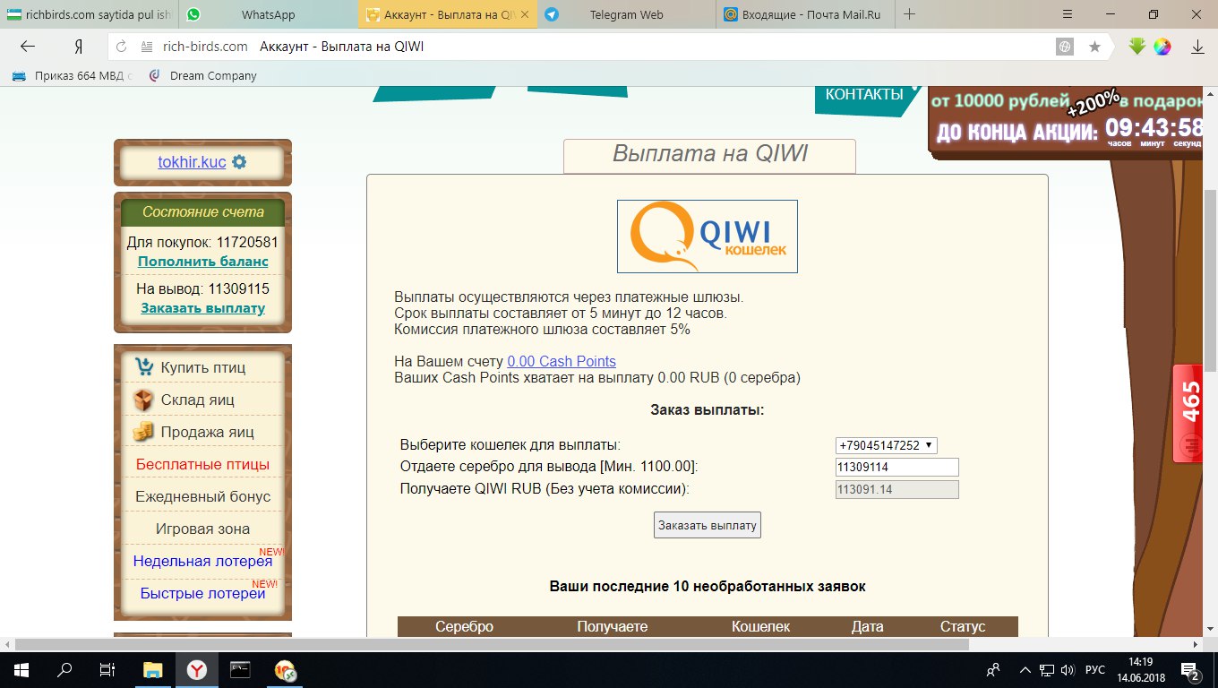 assalomu alaykum forum azolari men sizlarga eng zo'r saytni taklif etaman bu saytda sizga bonus 1000 serebro beradi bunga siz 1ta ko'k qush sotib olasiz bu qush tuxum tug'averadi va siz atigi 10 daqiqa ajratib bu tuxumni sotasiz va siz balanizga pulni tushurvolasiz atigi o'n daqiqa va mo'may daromad
