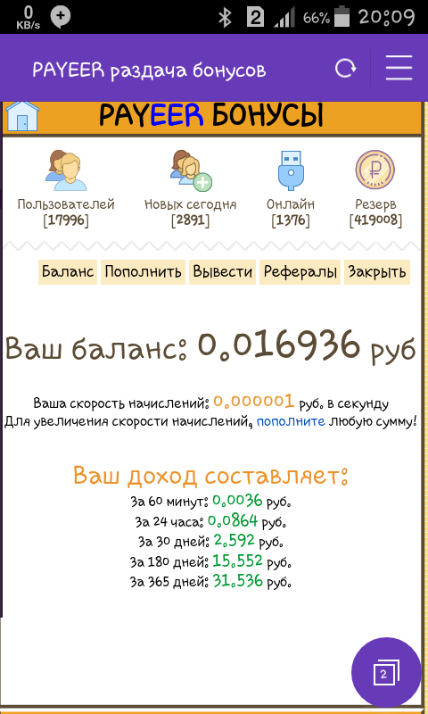 Bu saytda pul ishlash uchun payeer xamyoningiz bilan ro‘yxatdan o‘tasiz va bonuslar vaqtga qarab yig‘iladi. Minimalka 1 payeer. Reflardan foyda 15%