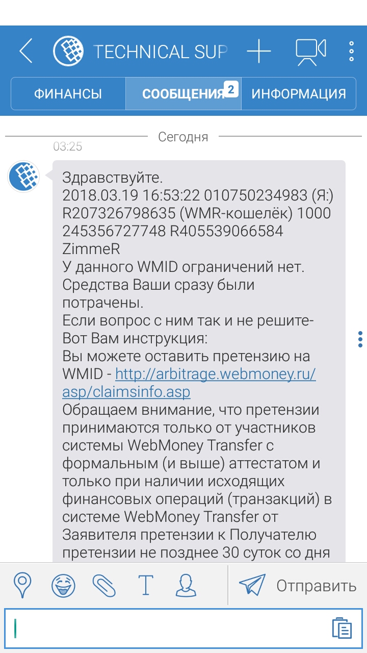 Support Group (02.04.2018 13:10:42) For all participants of financial pyramid our answer is: 8.1. We shall not reimburse any losses that YOU may incur in case of culpable (intentional or careless) violation of any requirements of the Agreement. In addition, YOU shall bear the risk of property losses caused by other reason, except as specified in Art.8.2. 8.3. Hereby You agree that: a) WM TRANSFER Ltd shall not be liable for the transactions You made to the order of casual users of the System or for the transfer of wrong amounts of title units due to the provision of incorrect information by Senders or Receivers. https://www.wmtransfer.com/eng/legal/transfert.shtml