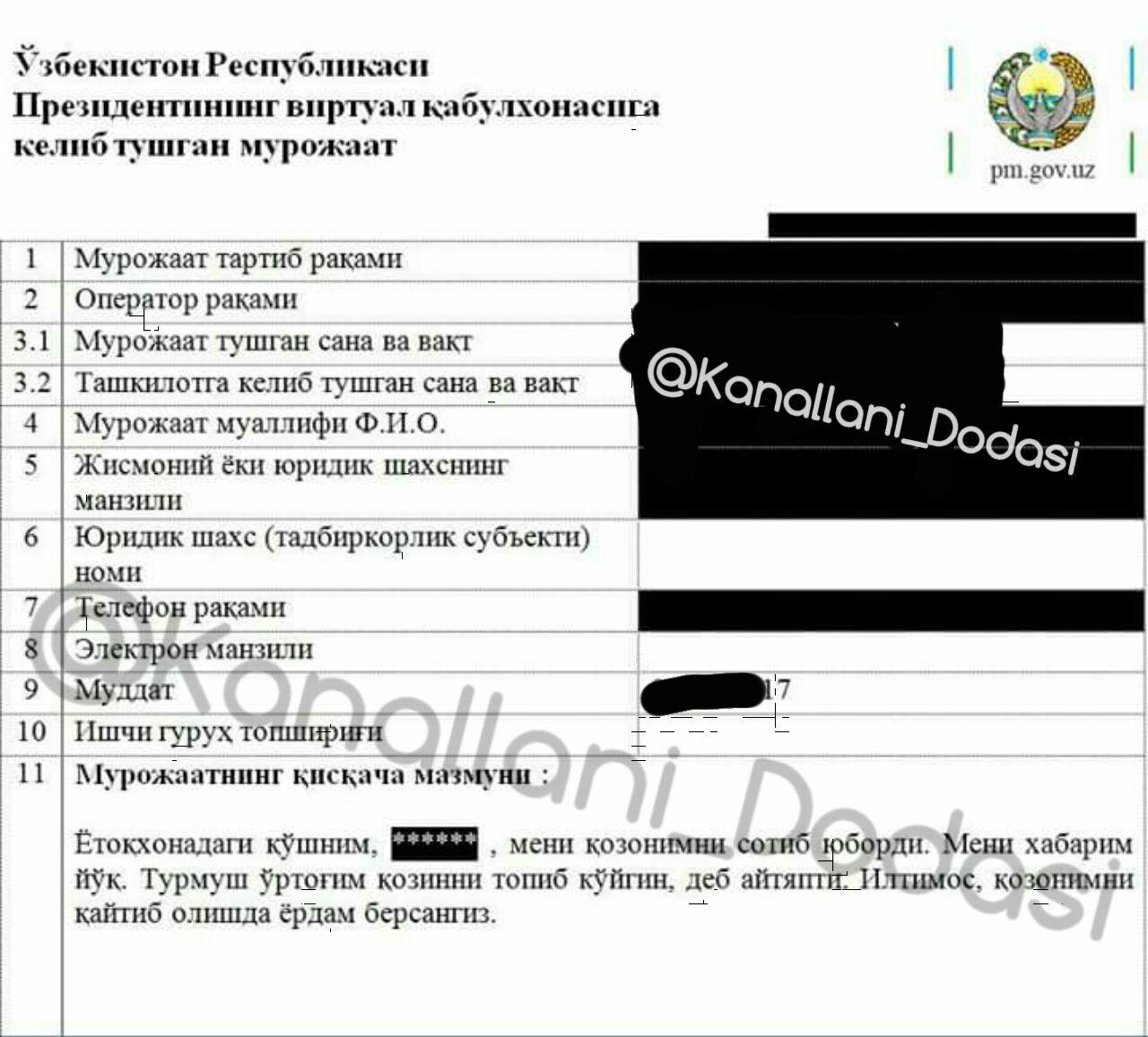 CHEfan, man yozganman... mani murojatim viloyatga so'ng tumanga o'tkazildi... 1oydan utibroq kurib chiqdi.... javobga kelsak zamhokim uyimga keldi 1soatlar tortishdim lekin foydasi bumadi...