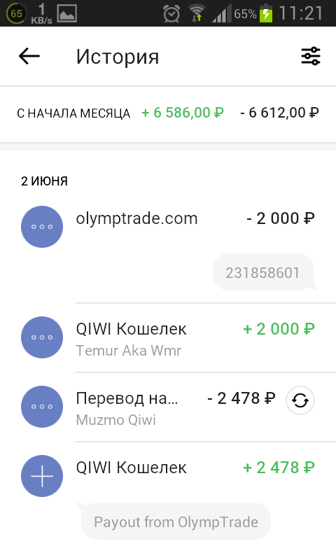 Salom dustlar man sizlarga olymptrade.com Tredere Xaqida aytmoqchiman minimalka 350 rubl 10$ qiwi webmoney mastercard visa cart orqaliy xam xisobiynani tuldirish mumkin yangi ruyxatdan utgan foydalanuvchilarga welcome bonus berilyapti bonus 100% bonus berish vaqdi cheklangan 1 soat amal qiladi man 1 oy ichida 6585 rubl ishladim va qiwi xisobimga tashab oldim pastda pul tashagani to'g'risida screnshotla manga kim ref bumoqchi bulsa ref ssilkani shxda beraman va ishlashdiyam urgataman agar ref busayna manga uynashdi urgataman