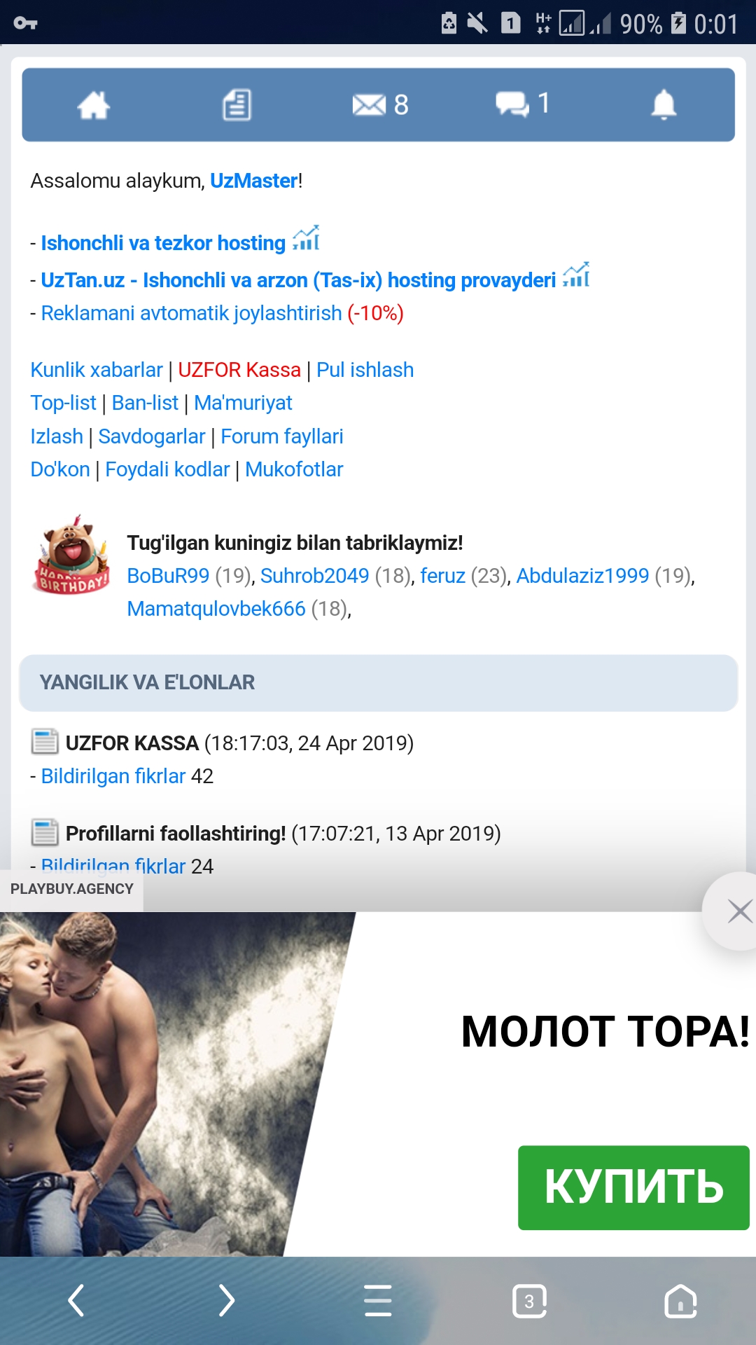 Har oyni birinchi haftasida qöysangiz menimcha hammaga qulay, forumgayam daromad, userlarni ham hamma"Nahotki"? Shu so'z ortiqcha bo'ldi. Hayratlanadigan joyi yo'q, bu sayt avvaldan reklamalar tarmog'i