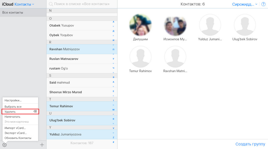 Mayli, kontaktlarni tezroq o'chirish eeng sodda usuli bu iColud dan o'chirish.