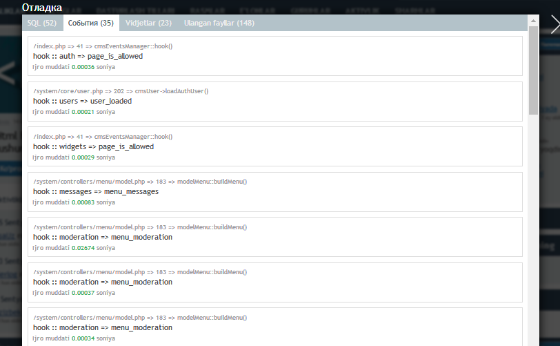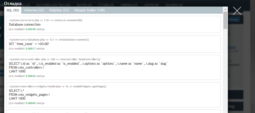 Bu CMSda saytning barcha bazaga yuborilayotgan va qabul qilinayotgan va baza qabul qilmagan yoki javob qaytarmagan so'rovlar, va ular bazadan jaov olishiga ketgan vaqtni har birini alohida "отладка" da ko'rinadi. Shuningdek qaysi vidjet sayt bazasidan qancha vaqta javob olganinia alohida ko'rsatadi. BATAFSIL rasmlarda