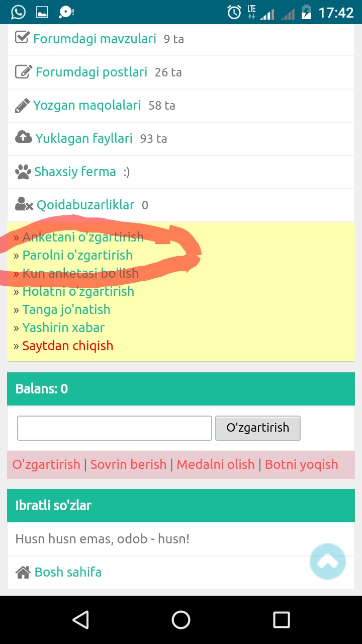 Saytda parolni o'zgartirish qayerda topa olmadim.