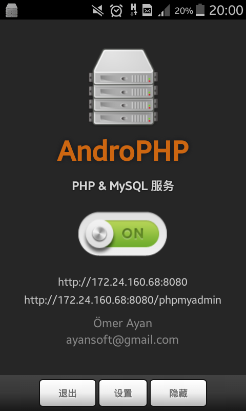 shu kodni yozing. Keyin AndroPHP ga kiring (knopka off bulsa bir marta bosing ustiga on buladi.) http://172.24...:8080 shuni ustiga bosing biror barawserni tanlab kiring agar test yozuvi chiqsa demak prog ishlayapti