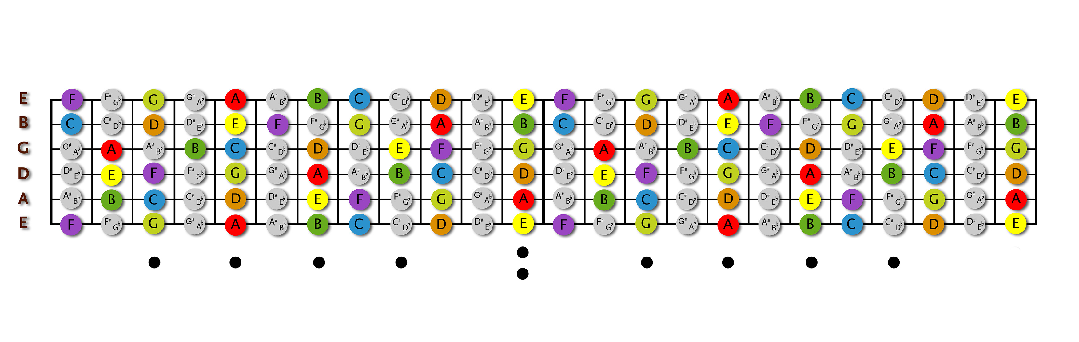 Қуйидаги жадвалда стандарт созланган гитара пардаларида ноталарнинг жойлашуви берилган. Торни очиқ чалиш 0 билан белгиланган. (б — бемол, # — дийез. )