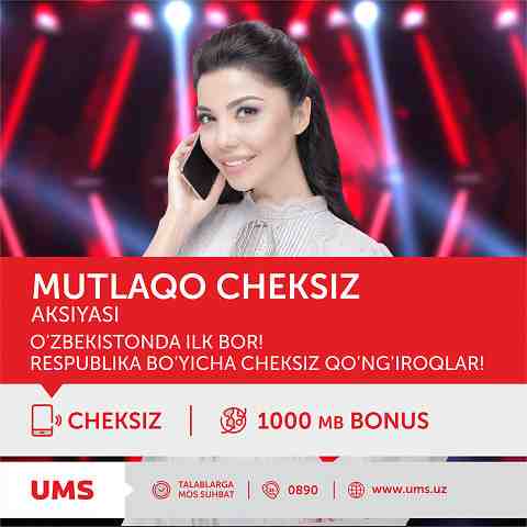“Mutlaqo cheksiz!” aksiyasini ishga tushirdik va abonentlarga 3 oy davomida O‘zbekiston bo‘yicha qo‘ng‘iroqlar uchun cheksiz daqiqalar hamda har oy 1000 MB bepul taqdim etamiz!!! Endi mamlakatimizning xohlagan uyali aloqa operatorlari tarmoqlariga va shahar raqamlariga xohlagacha qo‘ng‘iroq qilishingiz mumkin! Xizmatni yoqish va undan foydalanish uchun hech qanday to‘lovlar mavjud emas!