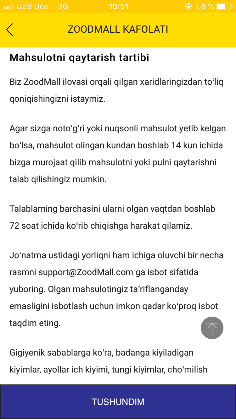 Yaxshi narsalar bor. Ammo jo'natilgan narsa rasmdagi dek sifatli bo'ladimikan? Kim narsa olib ko'rdi zoodmalldan?man naushnik zakaz qildim endi kelsa bilamz agar tovarni aybi bolsa pulni qaytarib beramz deb yozilgan