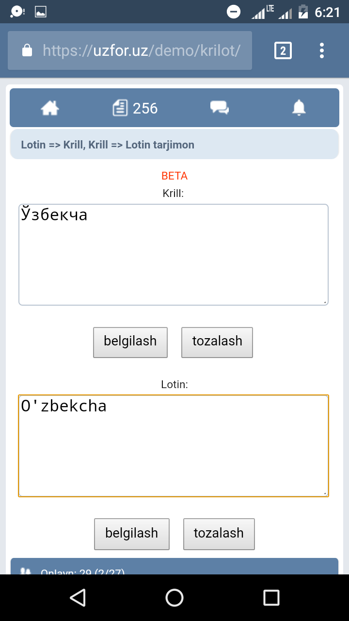 2. Lotin => Krill, Krill-Lotin tarjima qiladi.