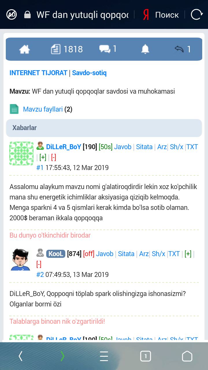 DiLLeR_BoY, menda sparkni 5 qismi bor qancha berasizBaraka topgur men qayerga yozdim Spark 5 kerak deb. Ona-tili o'qiganmisiz? Spark 4 kerak Gentra 5 kerak deganman shekili. Xudo xayrizi bersin sal diqqatliroq bo'ling