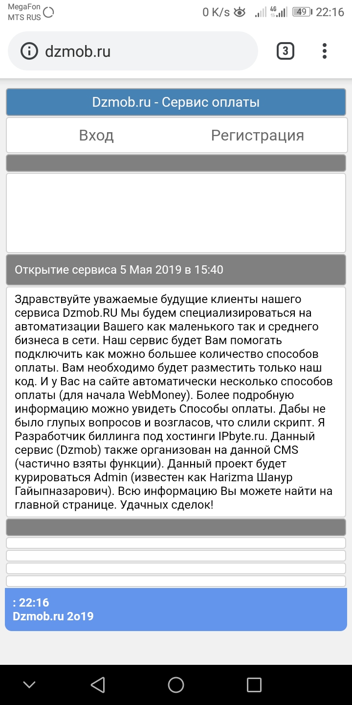 Assalomu alaykum forum ahli bugun men sizlarga yangi proektimni taqdim etaman bu tolov hizmati yani sizga webmoney merchant x18 kerak bolsa va u sizda bolmasa biz sizga uni taqdim etmoqdamiz sayt til sozlamalar qoyilgan lekn hizmatga ketmasimdan avvalgi uz tilini tarjima qilib beradigan dostlarim yoqligi sababli u sal keyinrok qoyiladi hozirlikcha faqat rus tilida servisga ulanish uchun malumotlar saytda "Подключение" bolimida toliq yozilgan va dcms va john uchun tayyorlari ham mavjud hozirlikcha komissiyalar vovod uchun 10 wmr uchun 0.08 wmr minimalka 15 wmr vovoddan oldin wmr koshelyokni tasdiqlash shart manzil http://dzmob.ru