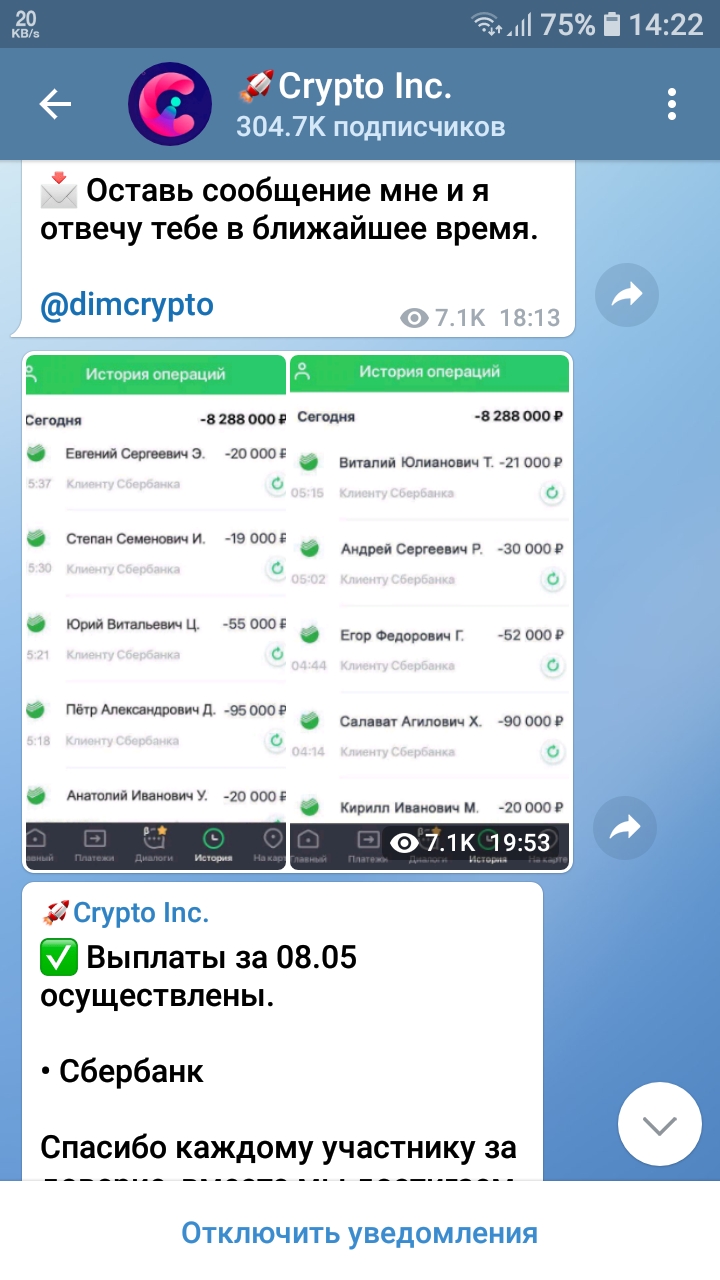 Shu kanal xaqida gaplashamiz kanal admini 10000 rubl investitisiya qabul qilib pulingiz 30000 rubl buganda qiwi sberbank visa yandex dengi fa tashlab berarga garantiya bor diyapti lisenzasiyam borakanХа толайди. Лекин катта микторда пул отказиш маслахат бермайман. У скриндагилвр балки озини достларидар, келишиб олишгандир. Масалан мен 100 одам топиб, улар билан келишаман, бу бошкалар наздида осон пул ишлашдек коринади ва хоказо