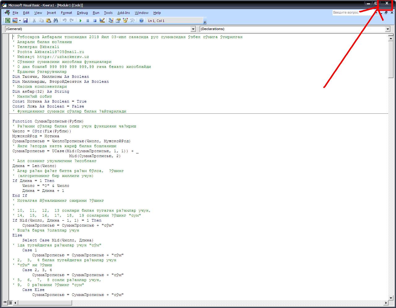 Shu turgan holda excel dasturidan chiqib ketmasdan «Ctrl+N» tugmasini teng bosasiz va yani exsel hujjati ochiladi. Ana biz макросni o`rnatib oldik. Bu ruscha yani rus rubilini hisoblagani uchun biz sizlar uchun shaxsan yozgib chiqqan kodni o`rnatib olishimiz kerak. Buning uchun yangi ochilgan excel hujjatga kirib "Alt+F11" ni bosamiz bunda quyidagi rasmga o`xshash oyna ochilishi kerak.