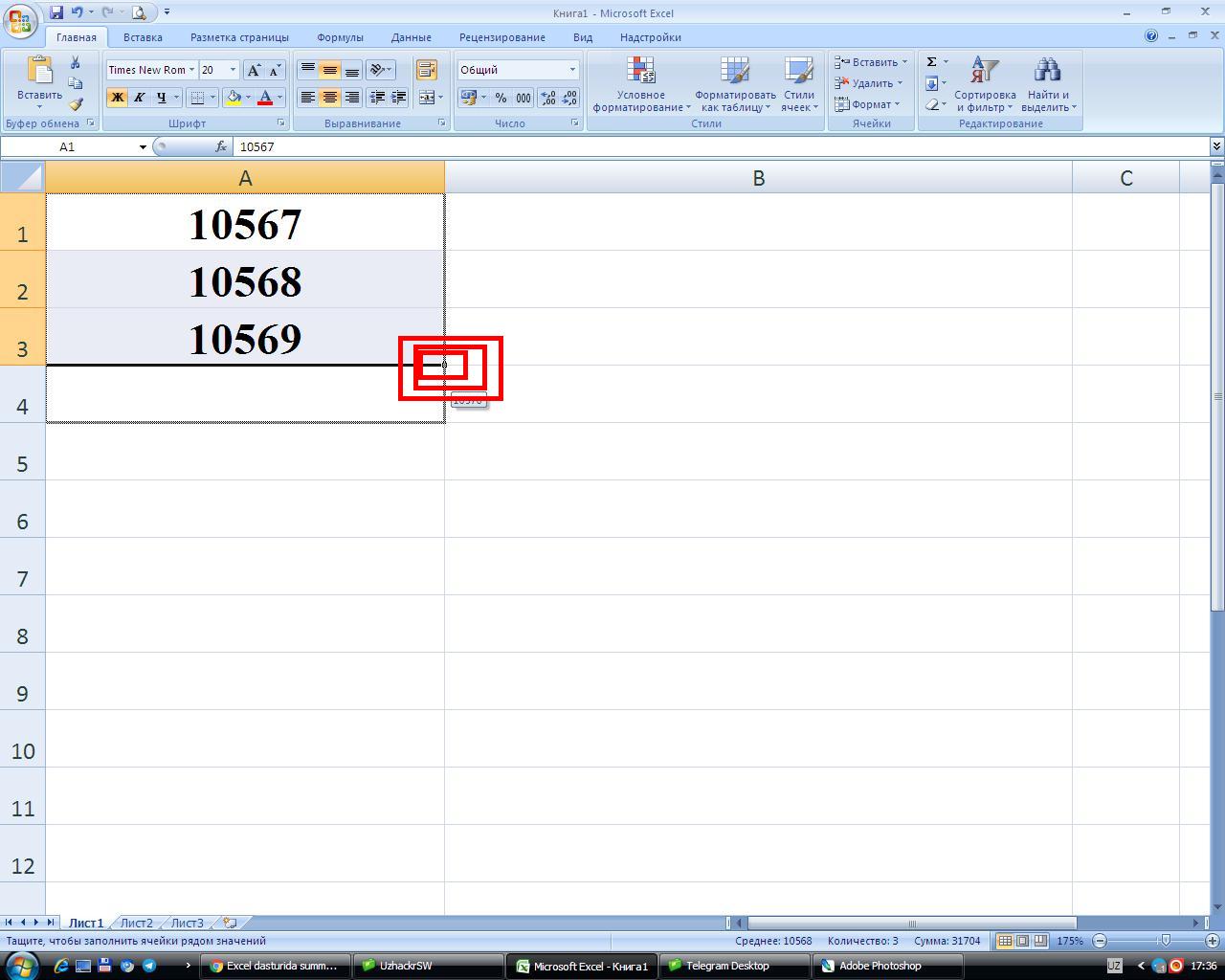 Raqamlarni belgilab Qizilda belgilangan joydan pastga qarab tortamiz va raqamlarni ko`paytrib olamiz.