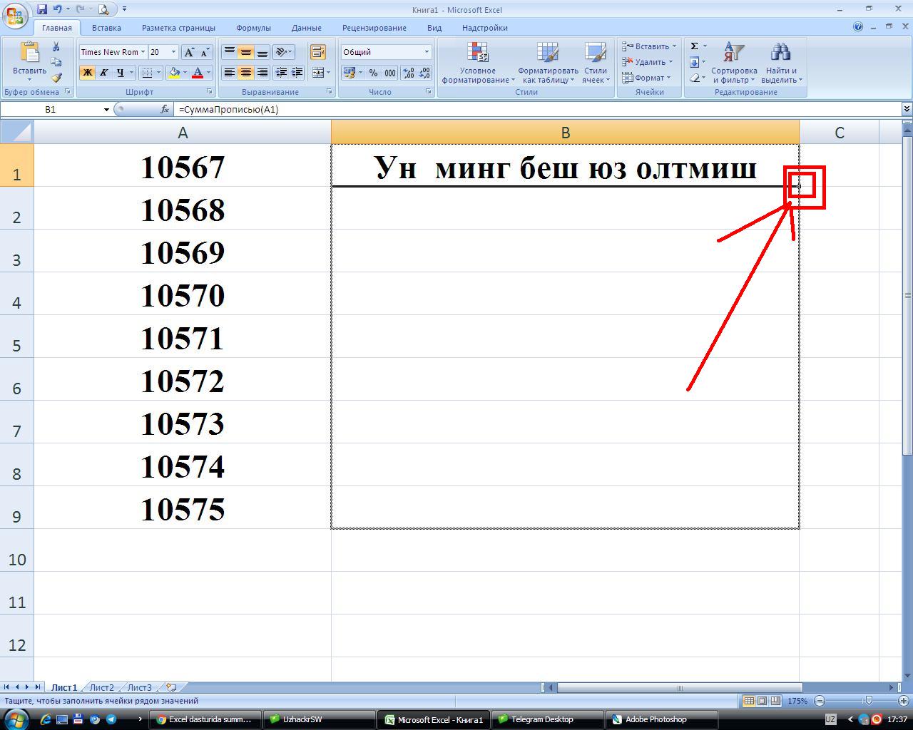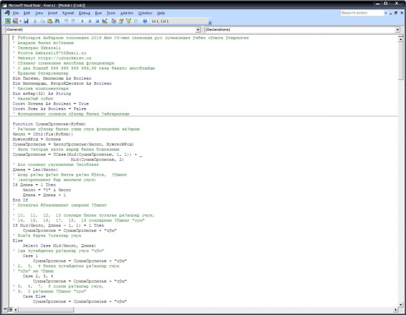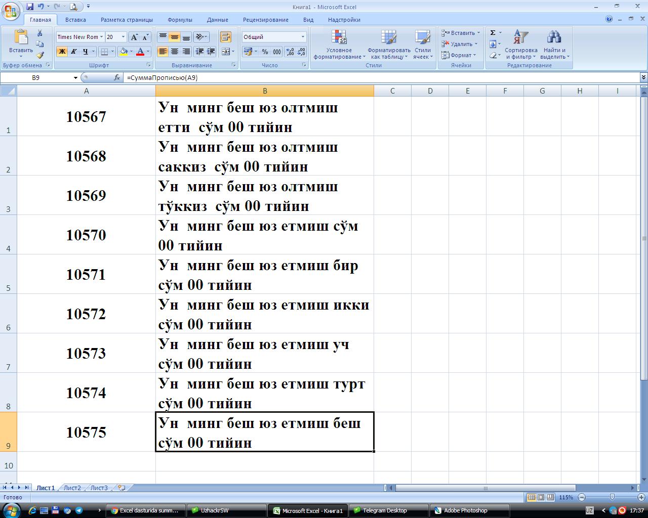 Bugun sizlar bilan Excel dasturida siz summani yozsangiz avromatik ravishda summani harf bilan yozib ketadigan daturni ko`rsatmoqchimiz. Demak boshladik.