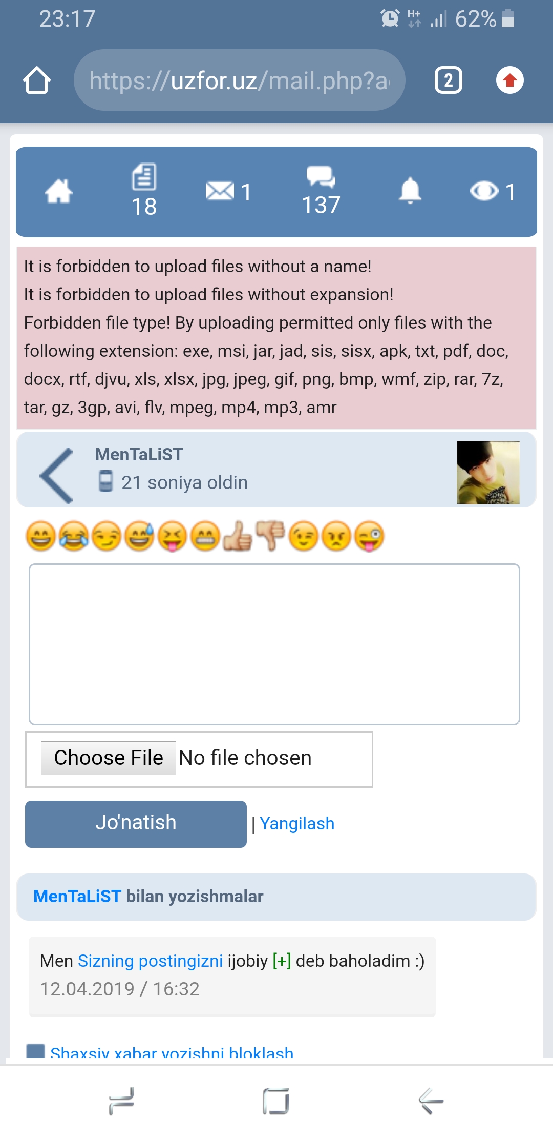 Shaxsiy habarlarda mp3 junatib bomayabdi. Mana shu narsani ham qarab qo'ysangiz boladi ekan. 22 daqiqa 45 soniyadan keyin yozdi: