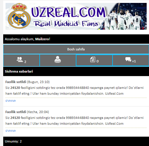 Ha aytgancha. Sayt endi menga tegishli emas. Kimidur minimalkaga yetgan so'mi yoki onlinesi bo'lsa marxamat wmrda yoki paynetda to'layman.