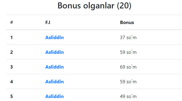 Har soat chatda yutuqli kod beriladi.Yutuq miqdori 10-100 so`m oralig`ida avtomatik belgilanadi.Kodni 1-kim kiritsa o`shanga yutuq yoziladi.