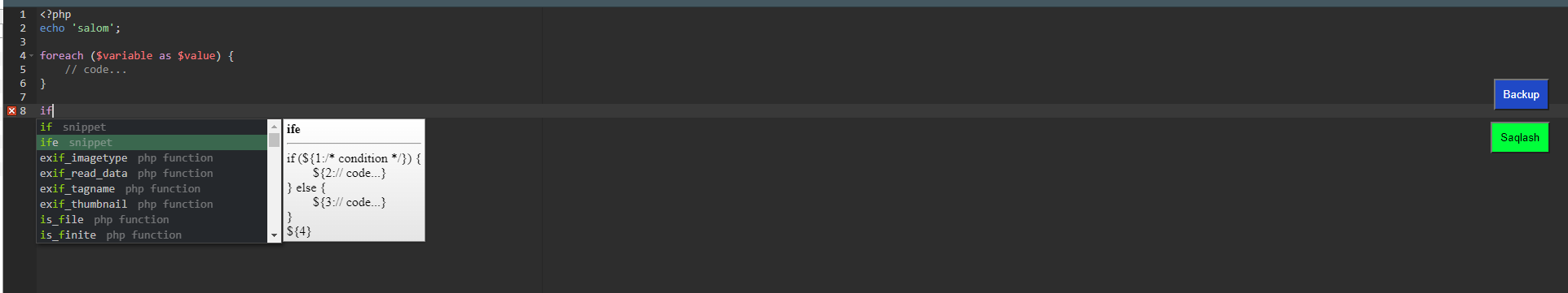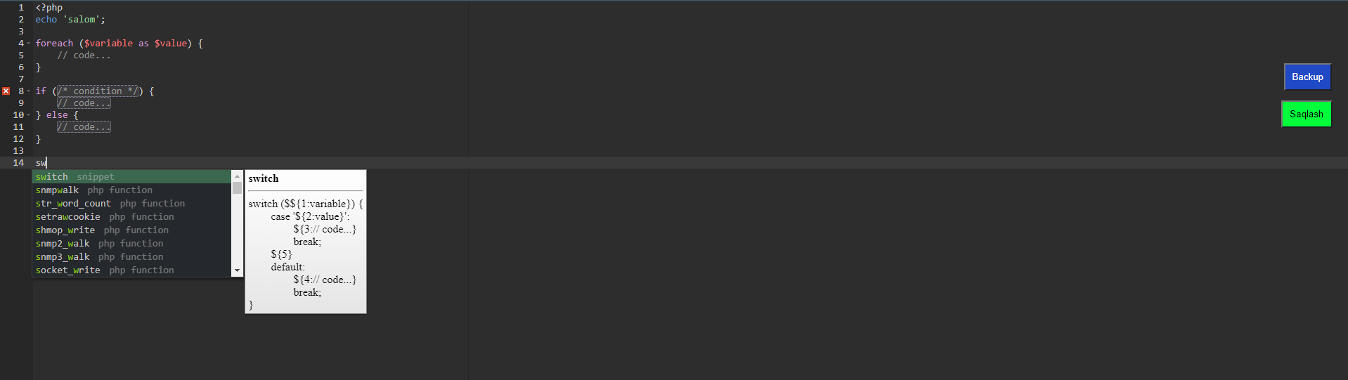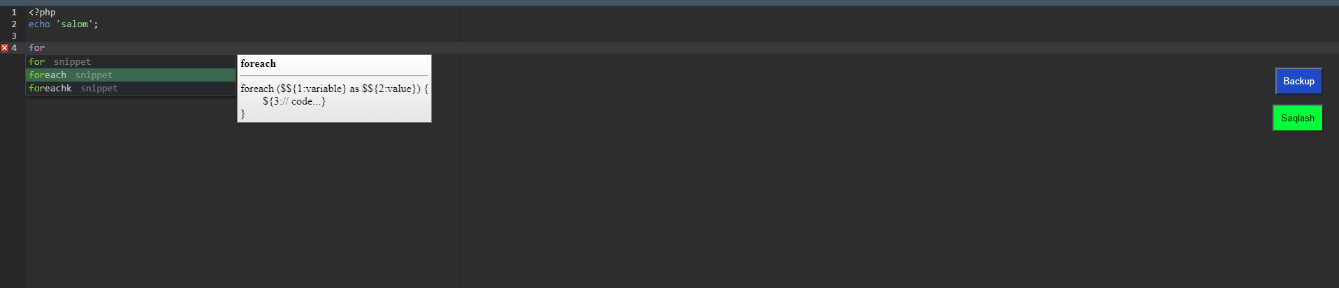 ctrl+b da faylning o`sha turishidan backup olib qo`yadi (keyn siz kodni yozaverasiz mobodo o`sha versiya kerak bo`sa fayl o`sha papkada boshqa nom bilan saqlangan bo`ladi)