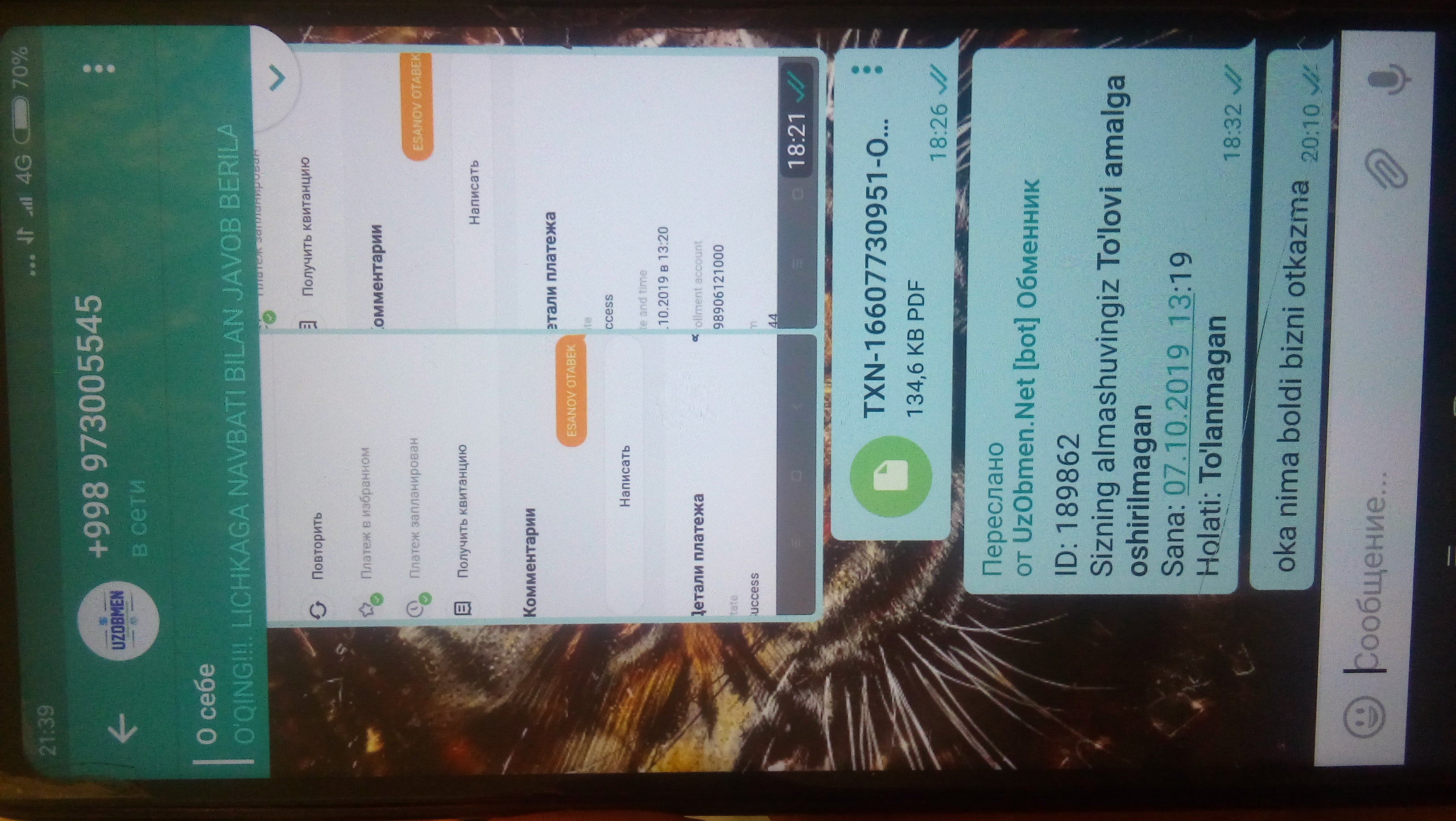 uzobmen bot administratsiasi telegram kanalida xabar berdi yani: Xurmatli foydalanuvchilar bank kartamiz‘da bank tomonidan xatolik yuz berdi xozirda shu muamo bo‘yicha ishlamoqdamiz, to‘lo‘vlar bir oz kechikishi mumkin buning uchun uzr so‘raymiz! deb xabar yuborildi mavzu mualiffi ozgina kuting bu saytdanam yoki telegram botidanam aldanganla yo‘g‘ to‘lo‘v qilishadi albatda