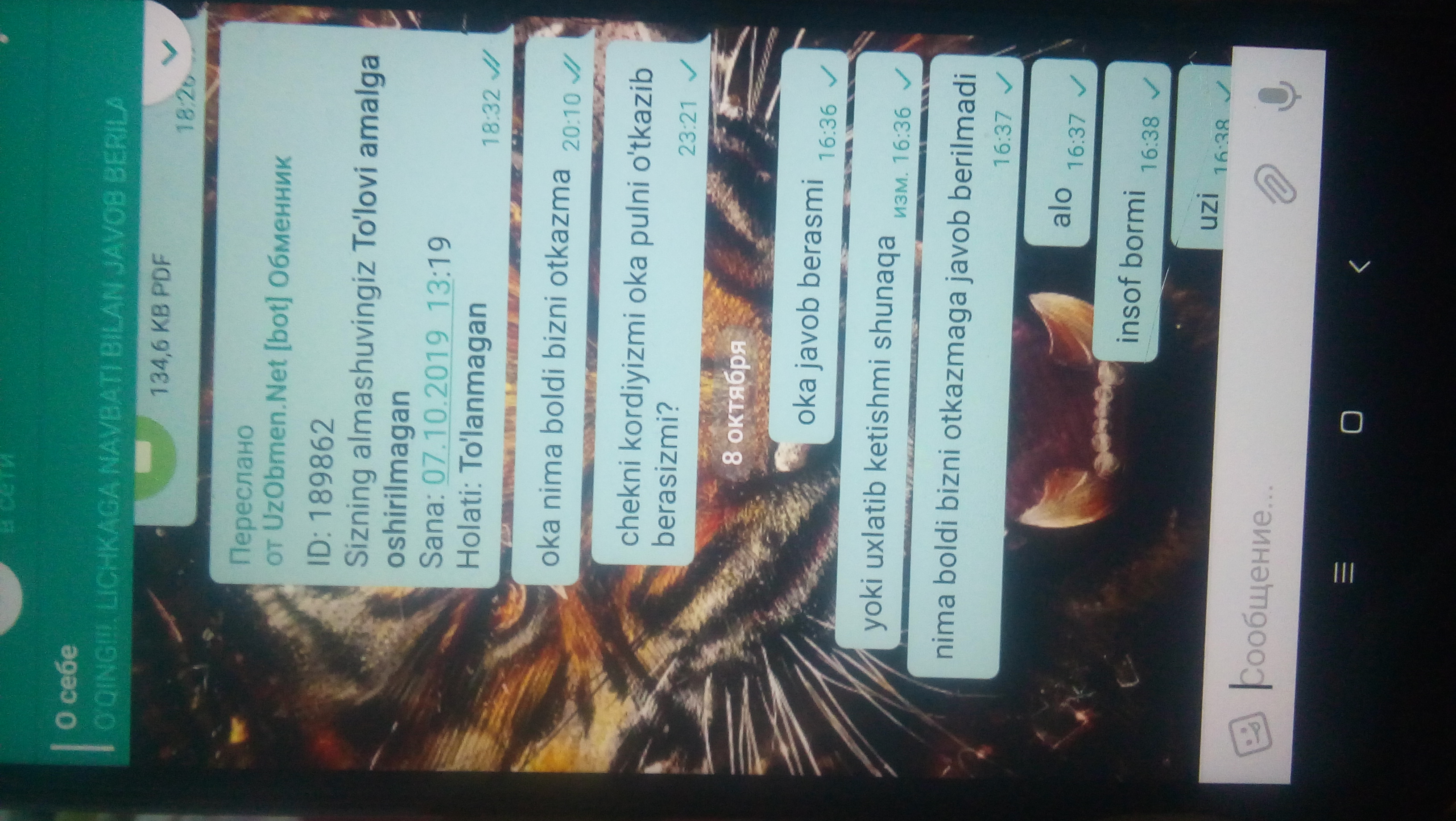 uzobmen bot administratsiasi telegram kanalida xabar berdi yani: Xurmatli foydalanuvchilar bank kartamiz‘da bank tomonidan xatolik yuz berdi xozirda shu muamo bo‘yicha ishlamoqdamiz, to‘lo‘vlar bir oz kechikishi mumkin buning uchun uzr so‘raymiz! deb xabar yuborildi mavzu mualiffi ozgina kuting bu saytdanam yoki telegram botidanam aldanganla yo‘g‘ to‘lo‘v qilishadi albatda