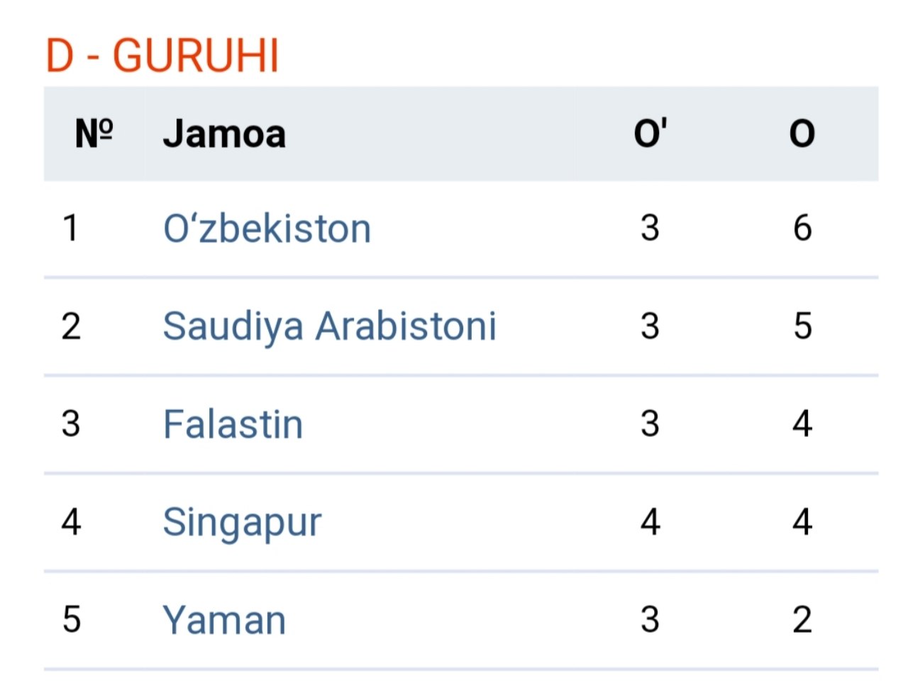 Bu mavzuda Milliy terma jamoamizning JCh-2022 saralash bosqichidagi ishtiroki haqida gaplashamiz, fikr almashamiz, tahlil qilamiz. Bugun jamoamiz V.Abramov boshchiligida ilk o'yinda Yaman terma jamoasini 5-0 hisobida mag'lub etib 3 ochkoni qo'lga kiritishdi. Birinchi o'yinda Falastinga 2-0 yutqazgandik. Uchunchi o'yinimiz 15-oktyabrda Singapurga qarshi o'tkaziladi.