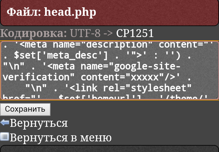 Keyin google sizga kod beradi. O'sha kodni head.php ga kiritib, podverdit qilasiz. Kodni scrinda ko'rsatilganidek xxxxx o'rniga joylashtirasiz.