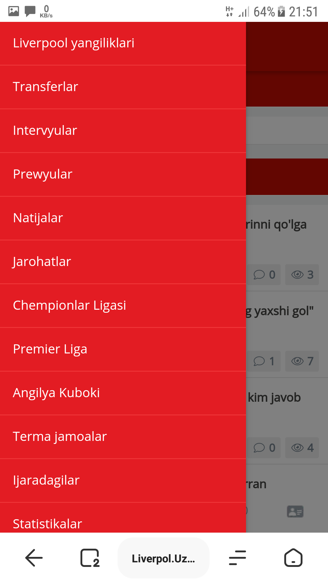 Assalomu alekum hurmatli forumdoshlar men bugun yangi sayt ochdim ushbu sayt liverpol club uzim liverpool muhlisi bolganim uchun ushbu saytni ochdim kimda qanaqa takliflar bolsa marhamat