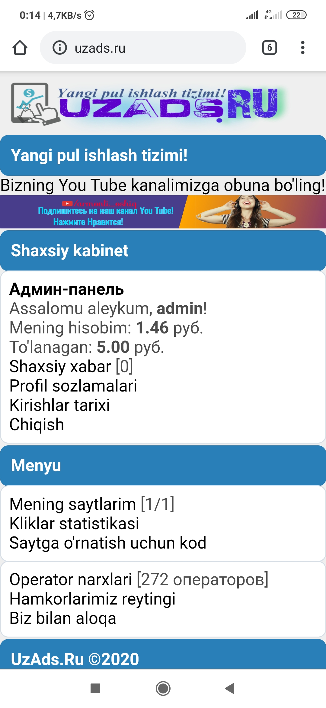 UzAds.Ru saytiga yangilik bu sayt orqali sayti yo'q foydalanuvchilar ham pul ishlashi mumkin 1klik=0.075rubl (1000klik=75rubl) shunday qilsak bo'ladimi xoxlagan ijtimoiy sahifalaringiz orqali pul ishlasangiz bo'ladi. Fikrlaringizni ko'tib qolaman?! Rahmat!