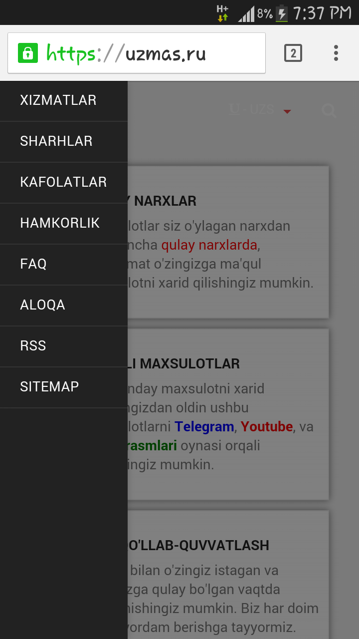 Qolgan ma'lumotlar bilan esa: http://uzmas.ru/faq.html ushbu manzil orqali tanishib chiqishingiz mumkin.