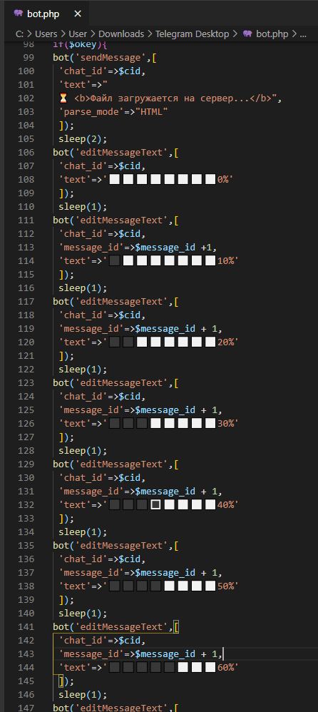 Akbarali, xa, xavfsizlikda xatolar bor, chunki bot podklucheniyada .php fayllarga filtrasiya qoyilmagan. Bemalol shelka tashab botni buzish mumkun, u xatoligini keyin tuzatmoqchi edim, xozir boshka biphpda php uchun filtratsiya qo`yishingiz huddi qog`ozni qog`ozga ishqalab o`t chiqarishday gap. Nu eplasa bo`ladi githubdan kattaroq loyihalarni ko`rmasangiz sizning yozgan kodingizni buzadiganlar juuuuda ko`p 1 daqiqa 9 soniyadan keyin yozdi: