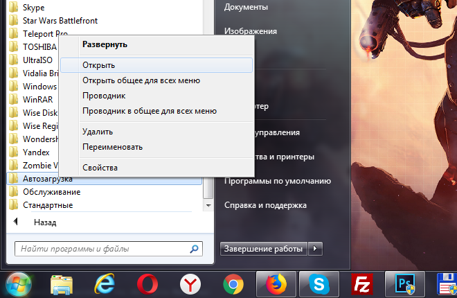 4. Keyin "Пуск" > "Все программы" bo'limiga o'ting, ro'yxatdagi "Автозагрузка" papkasini toping va ustiga o'ng tugmasini bosing, bu yerda ochiladigan ro'yxatda "Открыть" -ni tanlang.