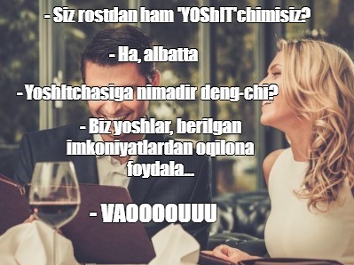 Doston, yo'q shu tashkilotda ishlaymanBekorga ishonch bilan yozmayapsiz... Unda yaxshi. Lekin men biror natijani ko'rmagan edim! Xudo xohlasa endi ko'ramiz! Bir niyatim bor Yoshlar Markaziga o'tamanda... (Navoiy)