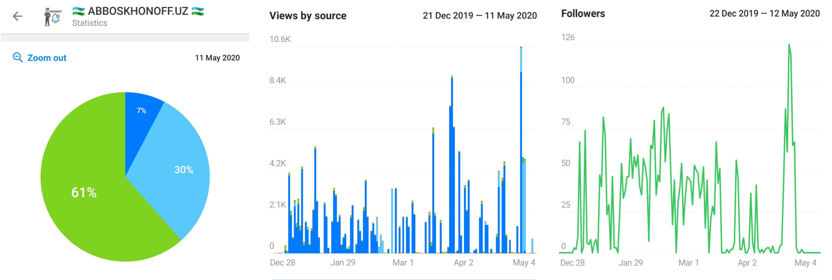 Kanal statistikasini batafsil screenshot orqali ko'rishingiz mumkin(2020.05.12 da olingan)